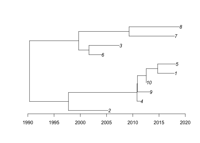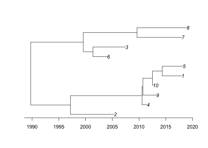 This is a basic example of usage. First we generate a dated tree with 10 samples between 2000 and 2020: