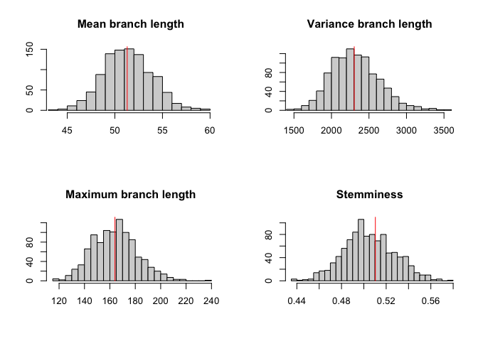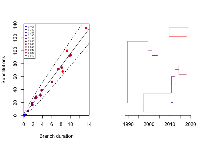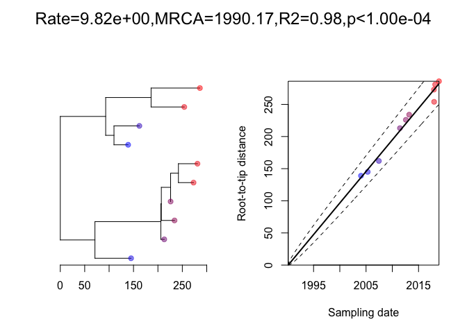 Next we generate a phylogenetic tree using a Poisson(10) mutation model, and perform a root-to-tip analysis: